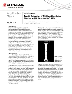 Every manufactured plastic is subjected to mechanical loading conditions throughout its operating lifetime. In order to prevent mechanical failure, it is imperative that the mechanical properties be determined and routinely verified to confirm that the material is suitable for the intended application. Tensile testing is one such method routinely used to determine the mechanical properties of plastics. Manufacturers, consumers, researchers and governing agencies are some examples of groups who perform tensile tests to ensure consistency, verify quality, and develop standards. Tensile tests are most commonly performed using a universal test frame, grips and an extensometer. Shimadzu Scientific Instruments offers a full line of test frames, grips and extensometers that meet or exceed the requirements outlined in testing standards such as ASTM D638 and ISO 527.