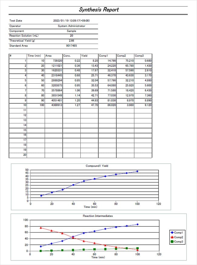 Using the multi-data report function, which can create and output reports in a spreadsheet-like format, the results for changes over time to the yield of the principal components of the synthesis, the creation of intermediate products, and the dilution rate in dilution testing can be output automatically.