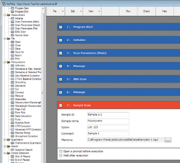 The “Easy Macro” function will create macros that are suitable for routine work, particularly when repetitive operations are used. The macro builder allows macros to be constructed by simply selecting and aligning operations from a list. Once constructed, the macros can be registered with the Launcher and Desktop for quick execution. Operators who are not familiar with FTIR can easily operate the instrument.